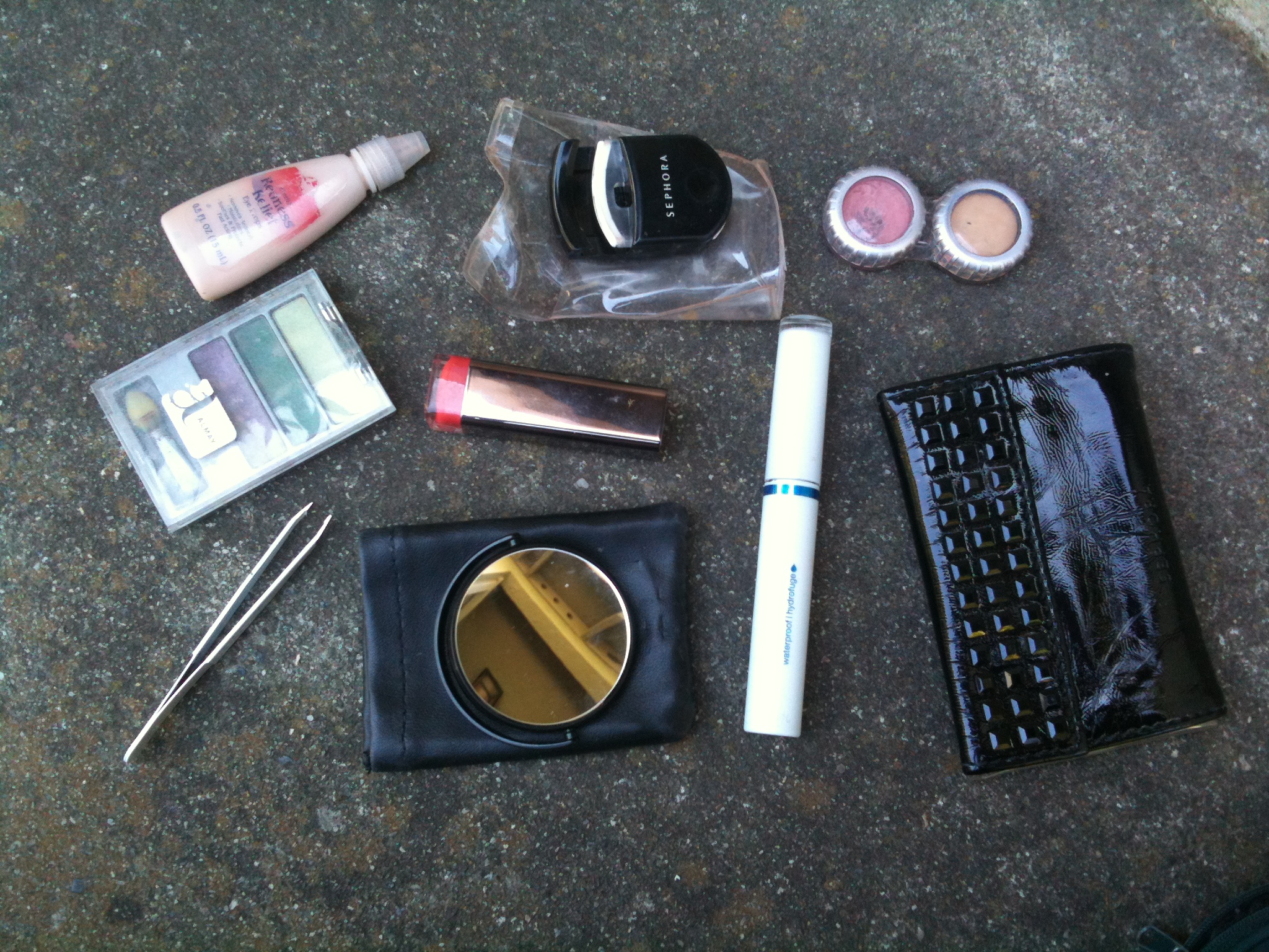 This is the contents of my travel makeup kit. Clockwise from upper left: liquid foundation, mini eyelash curler, contact lens case with cream blusher and concealer, travel makeup brush set, mascara, magnifying mirror, lipstick, tweezers, triple color eye shadow.