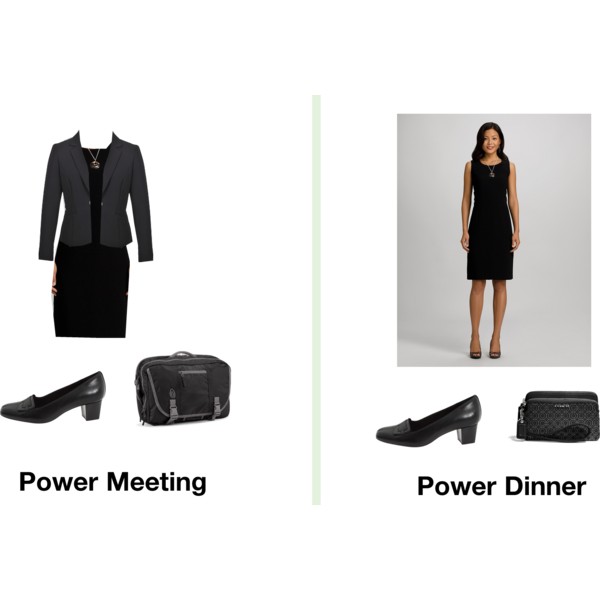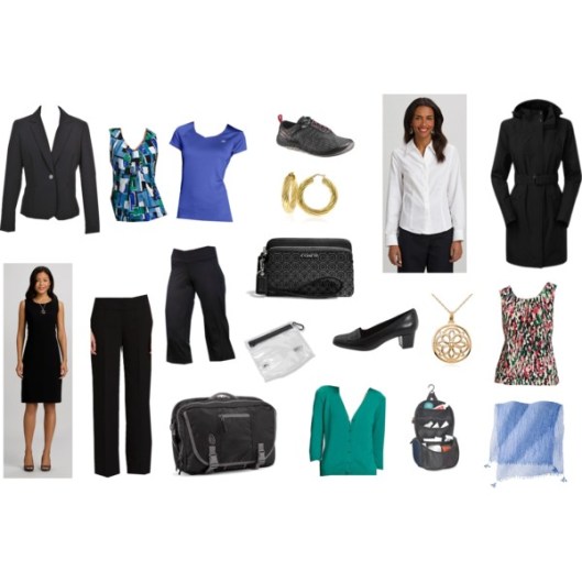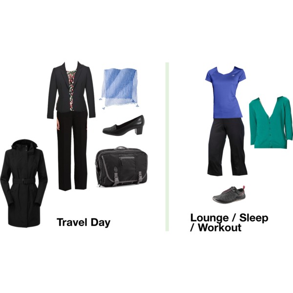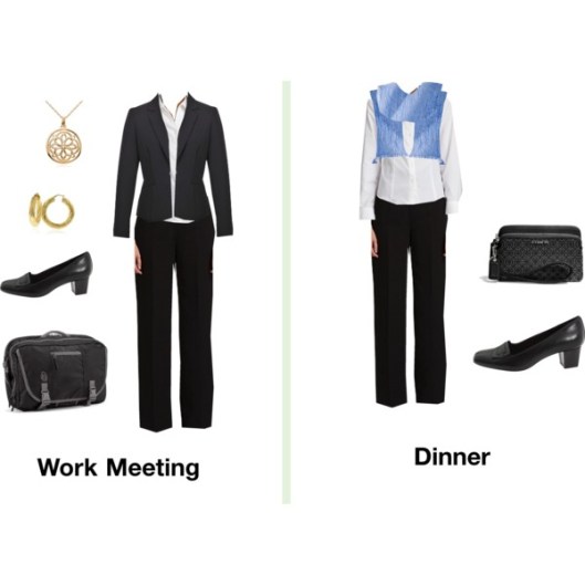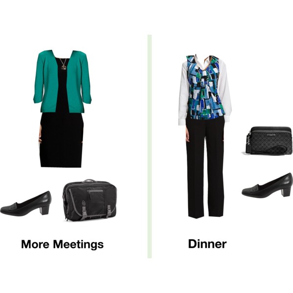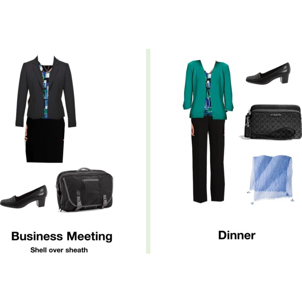 I prefer coordinated suit pieces for multi-day business trips.  I like a suit jacket with a sheath dress and a matching pair of pants.  The sheath is suitable for dinner meetings.  Add in a few jersey-knit shells and a white shirt and you have several outfits.  The dress shoes are geared for standing and walking.  I also bring workout clothes that double as sleeping/lounging clothes.  I work out in the morning, rinse out my clothes, and hang them up to dry.  They are ready to wear for bed time that night.  I always bring a light sweater because I get cold easily.  Add in a very light packable trench just in case of bad weather.