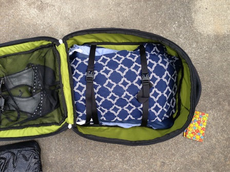 Bundle wrapping for my one and only under-seat bag. I have bundle wrapped my clothing around my undies, stockings and long underwear top. It’s all secured by the internal straps. I’ve put my nightgown on the outside so it is easily available. The dress is next so it doesn’t get wrinkled, followed by my skort and the blue shirt. The knit tee is last.